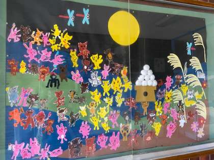 9月になり、玄関の掲示を2年生が作り飾りました。たぬき、きつね、ウサギなど楽しい動物たちを喜んで描きました。