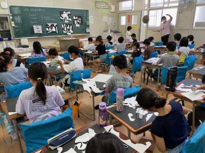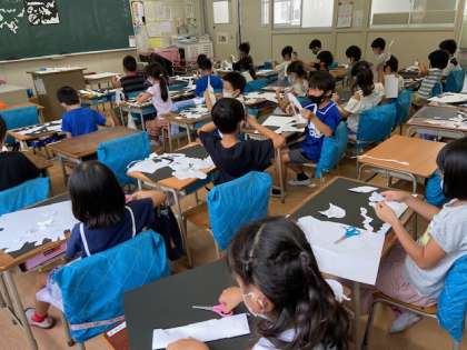 図画工作科の学習で「はさみのあーと」をしました。はさみを自由に動かして切った形から見えるものを想像し、絵にあらわしました。「へびに見える〜!」「わにに見える〜!」などなどいろんな世界を作り出していました。