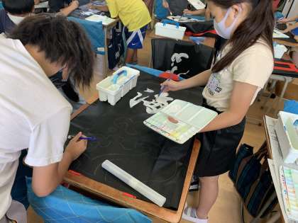 背中に自分たちで決めた漢字と波の絵を