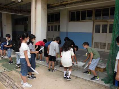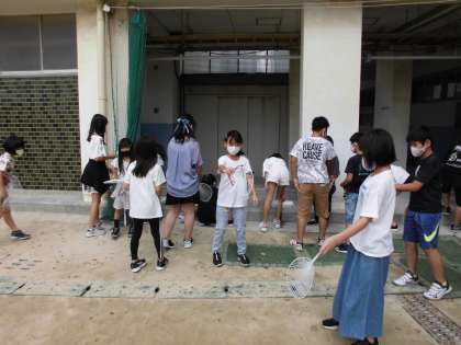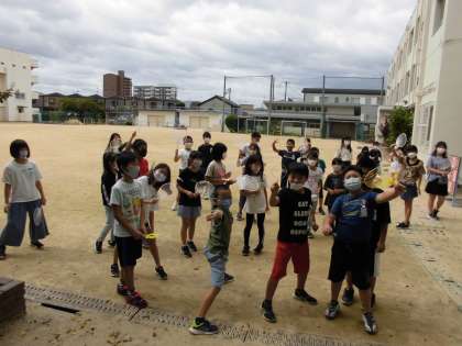 図工で絵を描くためにシャボン玉をしました。コロナなのでうちわや針金を丸くしたもので工夫して行いました。