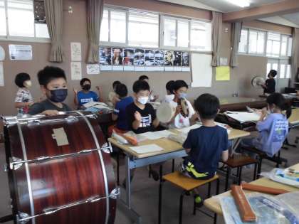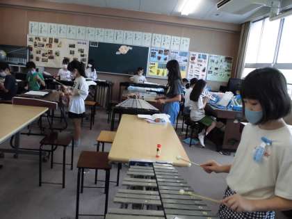 音楽室で合奏の練習をしました。パートごとに、自主練をしました。