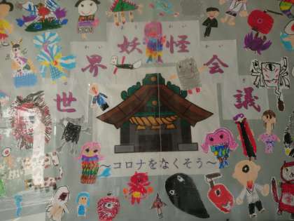「妖怪コロナ会議」という名の掲示です。妖怪がコロナ撲滅を期待して会議している様子を1年生なりに表現しています。