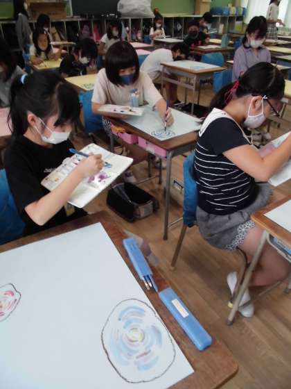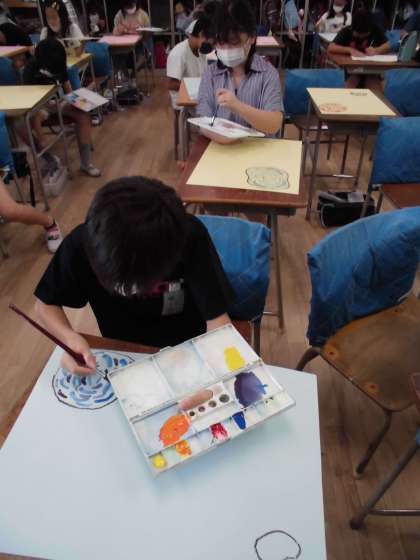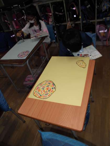 先日、楽しんだシャボン玉の絵画を描き始めました。太陽が当たって虹色に光っているシャボン玉をぬりました。