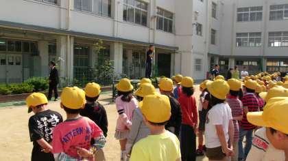 今日は、今年度初の運動場での児童朝会がありました。昨年度から2学級減ったので、こころなしかコンパクトになったような気がしました。