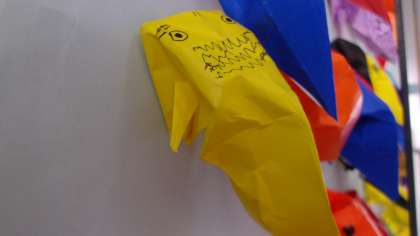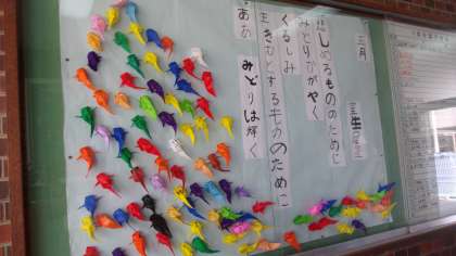 ふと玄関の掲示板を見ると、鯉が泳いでいました。何か気になるなぁと近づいて見てみると、なんと鯉が立体でした。5年生の素晴らしい力作です。作り方が気になるので、5年生に聞いてみようと思います。ぜひ、来校の際にご覧ください!!