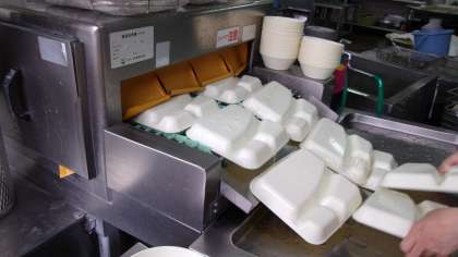 5.6枚目の写真は、1度きれいに洗った食器を熱湯消毒する機械です。ベルトコンベアに入ると熱湯で殺菌されて、出てくるときには冷やされて出てくる優れものです。しかし、食器にマーガリンのごみなどがついていると、故障の原因にもなるそうなので子どもたちにも気をつけてほしいと思います。