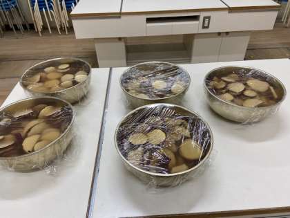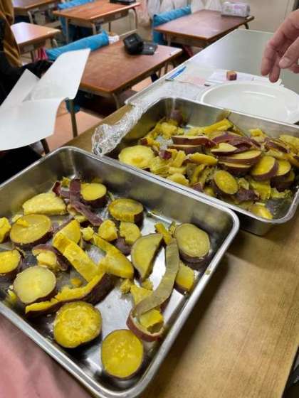 待ちに待った「さつまいも料理」の日です。生のさつまいもは、切るととても白いですが、湯がいた後は「黄金色」子ども達は「いいにおい〜!」と、わくわくです。
