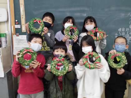 マカロニを使ってのクリスマスリースが完成しました。