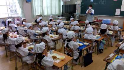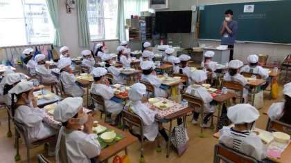 今日、1年生にとって、小学校最初の給食でした。(2年生以上のみんなにとっても、新しいクラスでの、初めての給食でした。)