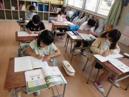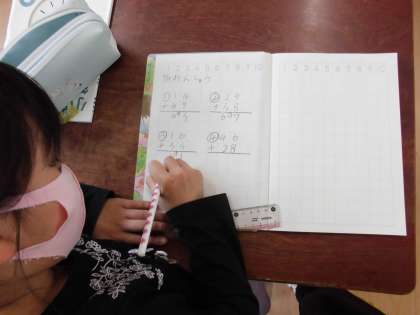算数科でくり上がりのたし算の学習に入りました。繰り返し練習を重ねて、力をつけていこうと頑張っています。