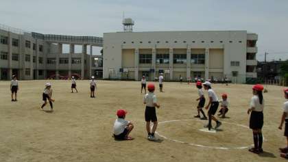 ここ数日、雨やくもりの日が続いていましたが、今日は久しぶりのいい天気! 3時間目の運動場では、4年生が体育でハンドベースボールをしていました。ティーにのっているボールを思い切り手で打ちます。うまく当たらず、強い当たりは出ないけれど、一生懸命1塁に向かって走っています。守っている子は、飛んできたボールを一生懸命追いかけて、本塁に投げています。お互いに元気に声をかけあって、元気に走り回っている姿がとてもさわやかでした。晴れの日が続くといいのにね!