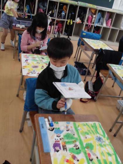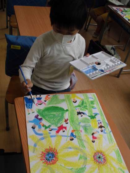 待ちに待った絵の具です。子供もたちは、わくわくしながら取り組みました。ひまわりの周りに吹く風を自分の好きな色でふんわりと描きました。