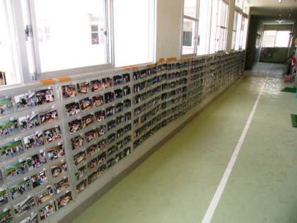 5年生の教室前廊下の壁面に、大量の写真が貼られています。