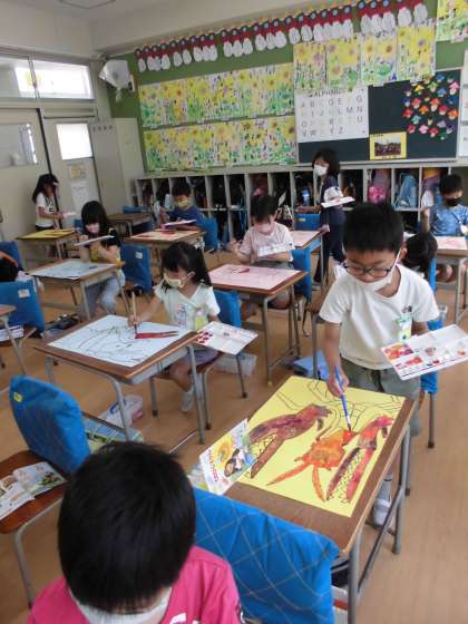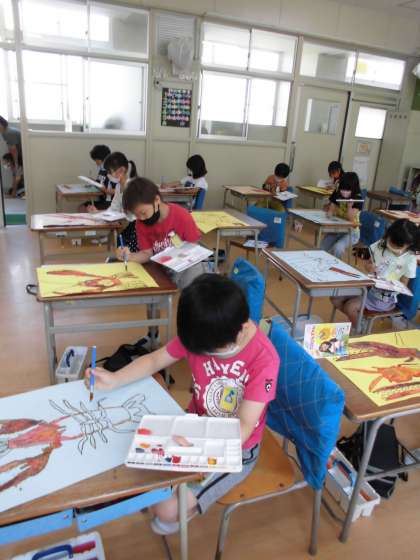 生活科でザリガニを飼育しています。そのザリガニを描いています。