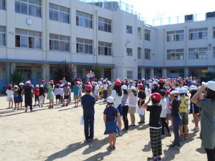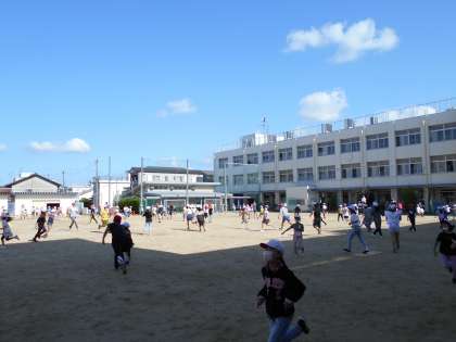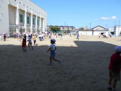 今日は、涼しく爽やかな良いお天気の中、フレンド集会で「バナナ鬼」という鬼ごっこをしました。みんな楽しそうに運動場を駆け回っていました。楽しんでいました。