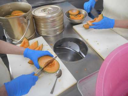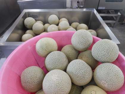 このメロンを調理員さんが一個一個切って、丁寧に種を取り除いてくれているのです。