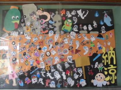 7,8月の玄関掲示は、二年生です。暑い日が続きますが、少しでも涼しくなるように学年のみんなでお化けを作りました。ご来校の際には、ぜひご覧になってください。かわいいお化けがお待ちしております。