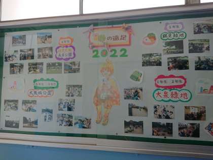 今、PTA広報板には、春に行った楽しかった遠足の様子が飾られています。