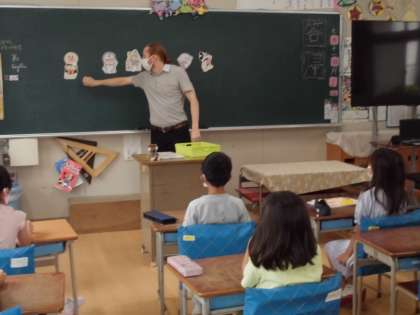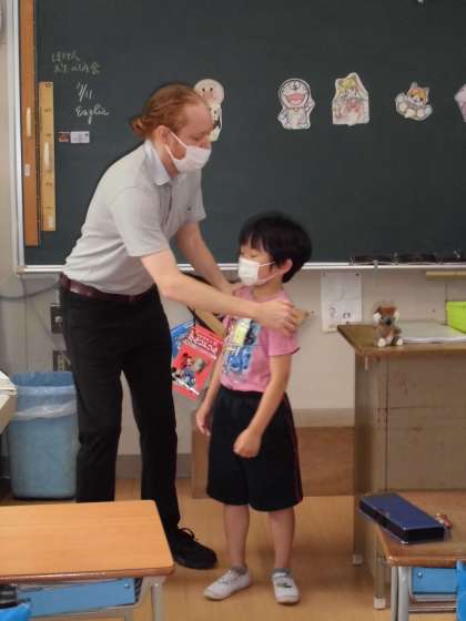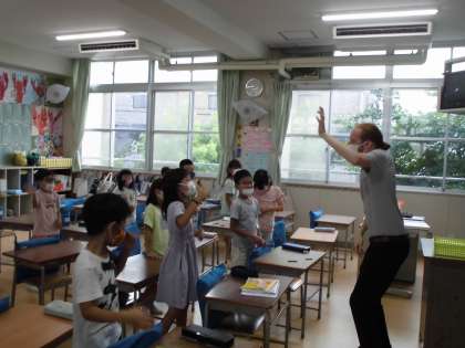 二年生になって初めてキャメロン先生と英語の学習をしました。ハローソングを歌ったり、自分の名前を言う練習をしました。