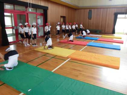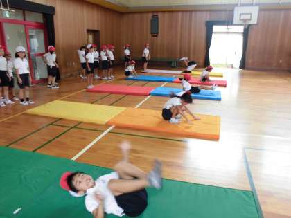 毎日暑いですが、今日は体育館で体育をしました。マット運動をしました。