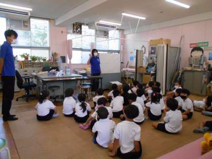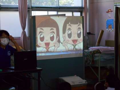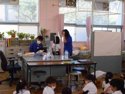 始めに、ほかの学年と同じように熱中症予防のビデオを見ました。運動会の練習でもしっかり水分を取ることを学びました。その後は、一人ひとり身長と体重をはかってもらいました。