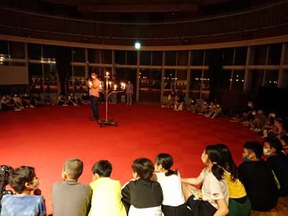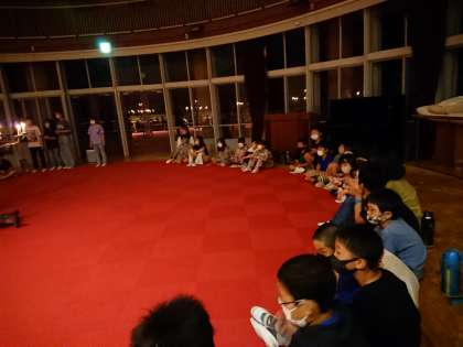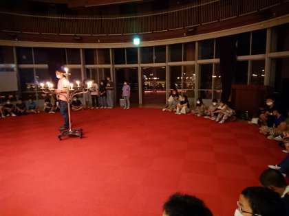 雨が降ってきて、急遽キャンプファイヤーならぬキャンプキャンドルにきりかえ、出し物を楽しんでいます。