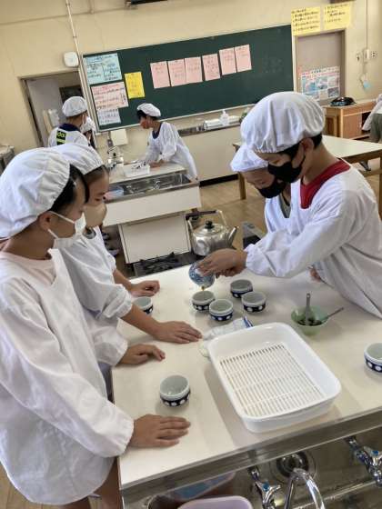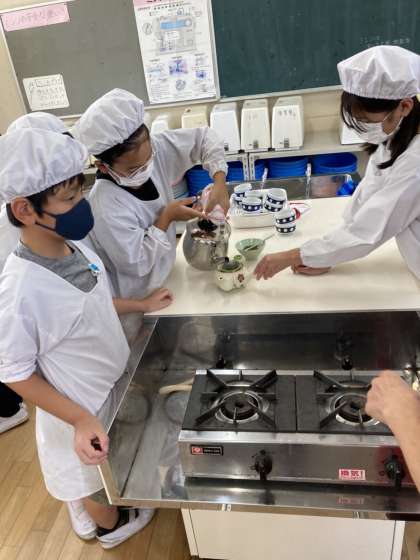お茶入れ方を学習して、調理実習で煎茶とほうじ茶の飲みくらべをしました。上手にできたかな?