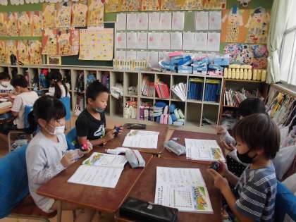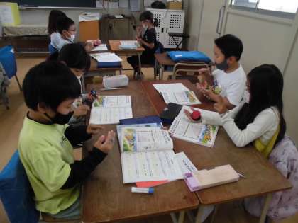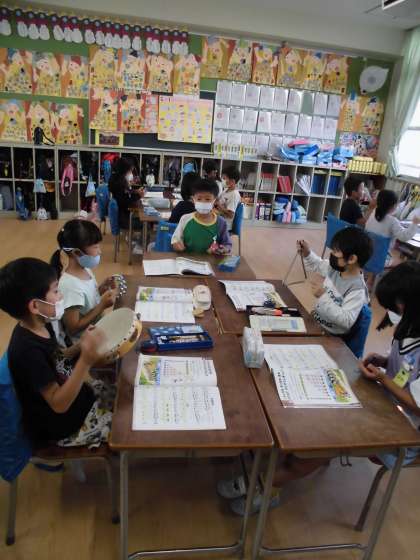 音楽の時間にグループで好きな楽器を選んで歌に合わせて演奏しました。まずは、練習をしました。