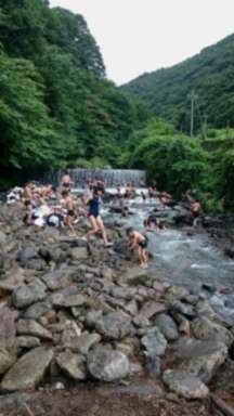 大阪の天気は雨が激しくなってきていますが、鉢伏高原では、子どもたちのパワーにおされて、雨雲が少しそれていっているのかもしれませんね。子どもたちは楽しそうに川遊び&魚つかみをしています。山にかこまれ、あふれる自然の中の川で、水しぶきとともに子どもたちの笑顔が飛び交っています。