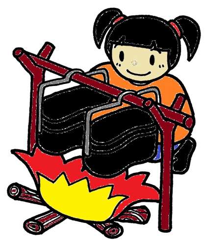 川遊びの後の野外炊飯は、雨がぱらぱらしているため、川原でする予定でしたが、屋根のあるキャンプファイヤー場に場所を変更して行いました。カレーだけ自分たちで作りました。野外炊飯の後は、その場所で焼き板作りを行います。