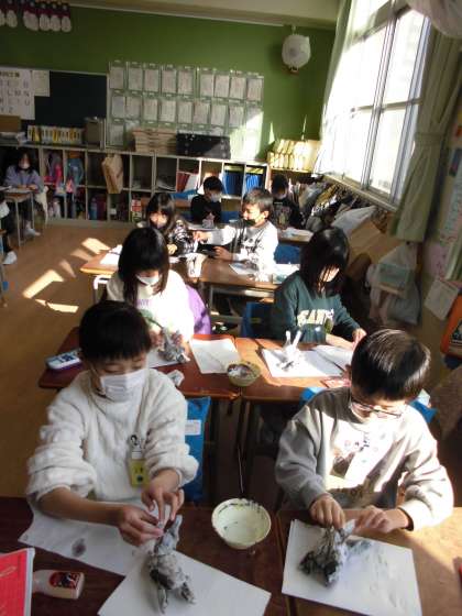 今年の干支であるうさぎを図工科で作っています。新聞紙で芯を作り、和紙を貼っています。