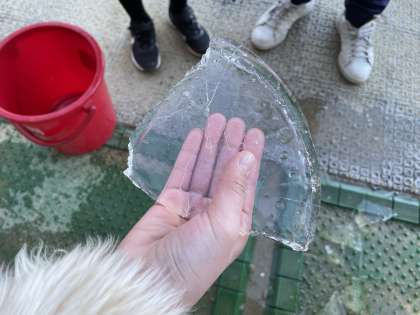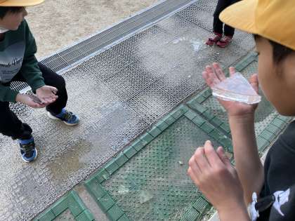 朝、教室の前で子どもたちが何やら話しています。見に行くと、バケツの水が凍っていました。大阪ではめったにないことなので、子どもたちは大喜びでした。