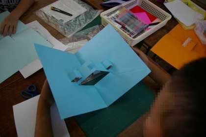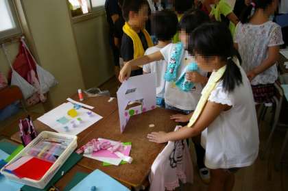4年図画工作科『とび出すメッセージ』という題材で、開くと立体的にとび出すメッセージカード作りの学習でした。家族の誕生日カードや運動会の招待状、感謝の気持ちを表すカードなど、思いを込めたメッセージカードを、とび出す仕組みを工夫しながら作っていました。バースデーケーキをかたどったり、泳いでいる姿を作ったり、もらった人が喜んでもらおうとする気持ちがみられた45分間でした。最後に友だちの作品を相互鑑賞し、友だちの良さを見つけていました。続きを明日したいとの声がでるほど、集中して取り組むことができました。