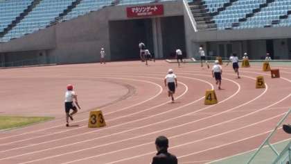 午前中は、5・6年生男子の4×100mリレーや100m走等の予選がありました。上の写真は、6年生男子の4×100mリレーの様子です。3レーンの白い帽子が清水丘小チームです。