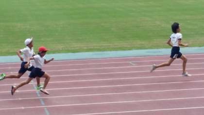 6年生の100m個人走の予選も行われました。白い帽子をかぶっているのが清水丘小学校のメンバーです。