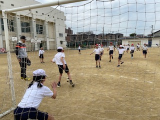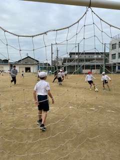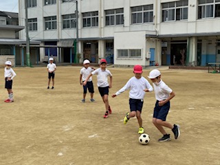 チームに分かれて元気にサッカーをしています。みんないい表情をしています。