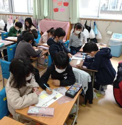 卒業する6年生に向けて、お祝いメッセージを書き始めました。給食や掃除を手伝ってくれたり、フレンド集会で迎えにきてくれたり…。たくさんのありがとうをメッセージに込めています。