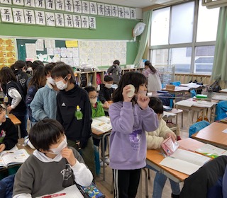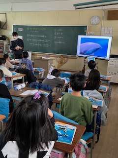 糸電話を使って、音が伝わるときのものの様子について学習しました。イルカの水の中での鳴き声の様子も動画で見ました。
