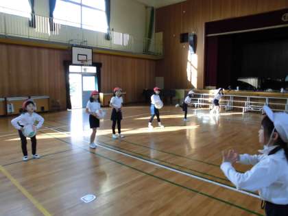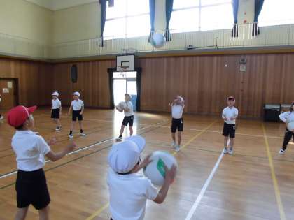 今日もみんな元気で体育館で体育をしました。ソフトバレーボールをしました。
