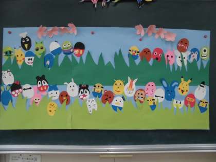 春の掲示物を作りました。イースターの卵を好きなキャラクターに見立てて作りました。