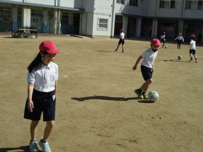 良いお天気の中、体育で大繩やサッカーをしました。大繩で八の字を練習しています。