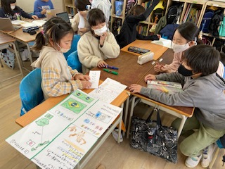 班で相談して調べた事を画用紙にまてめていきました。