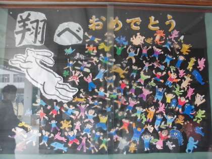 三月の掲示は、二年生の担当です。6年生へのお祝いの気持ちを込めて作りました。ご来校の際には、ぜひご覧ください。