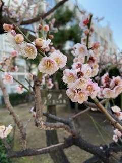 正門横の梅の花がとても綺麗に咲いて、いい匂いがただよっています。