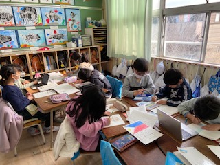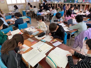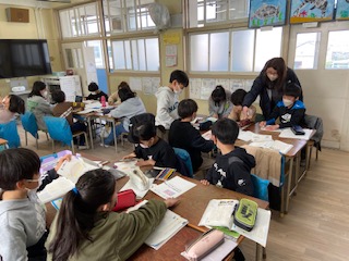 「外国のことをしょうかいしよう」の学習では、協力し合いまとめています。