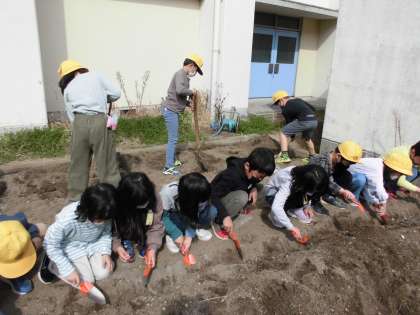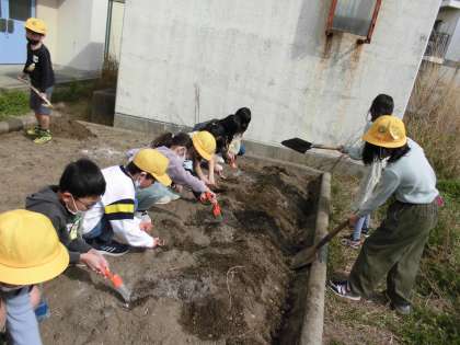 今日は、先日草抜きをした学習園に畝を作りました。みんな汗まみれで頑張りました。