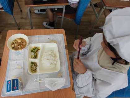 新学期二日目、給食が始まりました。今日の献立は、マーボー豆腐でした。美味しくいただきました。