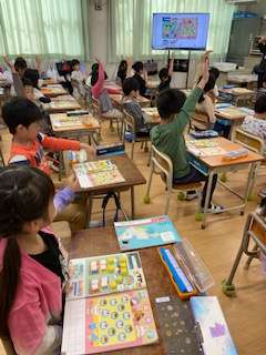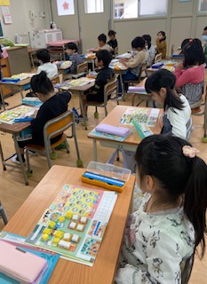 「算数セット」の中からブロックを自分で出し、さっそく使って算数の数のちがいを学習しました。