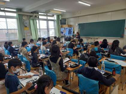5年生が毛筆で「道」を書いていました。先生の書く様子を大型モニターで確かめながら、集中して取り組めていました。