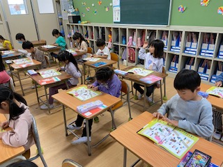 国語「ひとと つながる ことば」の学習では、絵を見ながら、吹き出しにあう子ども同士の会話を考えました。